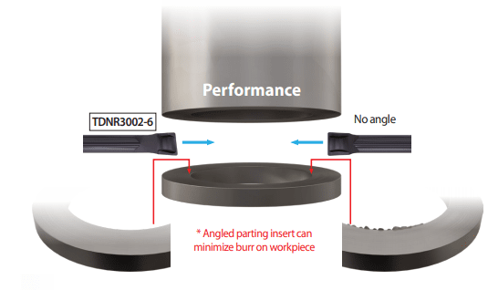 YG-1 has launched a newly developed “double sided 6° front angled parting-off tool” optimized for steel, stainless steel and cast iron machining. It can reduce cutting force and machine load as well as remove the burr formation and the pip on the finished component due to the front angled geometry.