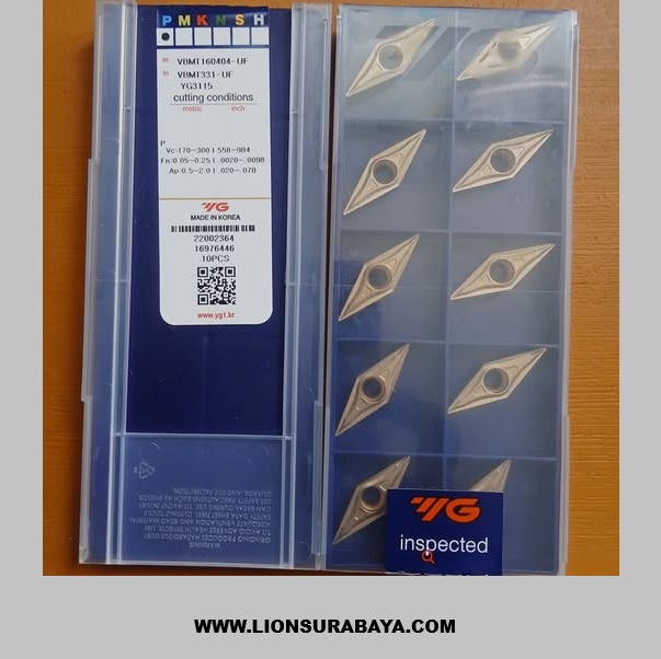YG-1 VBMT160404-UF YG3115 Insert bubut besi bajaInsert bubut YG-1 VBMT160404-UF YG3115 adalah mata pisau karbida (carbide insert) yang dirancang khusus untuk proses bubut finishing pada material baja (steel). Grade YG3115 merupakan generasi terbaru dengan lapisan CVD (MT-TiCN + Al2O3 + TiN) yang dioptimalkan untuk kecepatan potong tinggi dan masa pakai alat yang stabil. Spesifikasi Teknis Utama