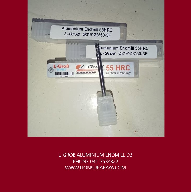 Endmill aluminium diameter 3mm (D3) merek L-Grob tersedia dari berbagai distributor dan penjual daring di Indonesia, dan umumnya merupakan jenis carbide dengan 3 flute yang dirancang khusus untuk pengerjaan aluminium.