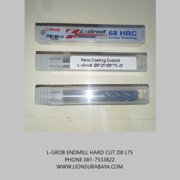Endmill hard cut D8 L75 HRC68 merk L-grob tersedia di Indonesia dan dapat dibeli melalui distributor online dan toko fisik seperti CV Lion Machine Solution