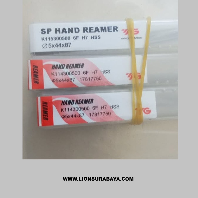 Hand reamer spiral HSS diameter 5mm merek YG-1 Korea tersedia dengan nomor produk K115300500. Reamer ini memiliki seruling spiral kiri (Left Hand Spiral Flutes) dan digunakan untuk pengerjaan lubang presisi dengan tangan.