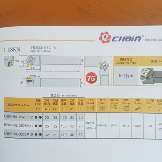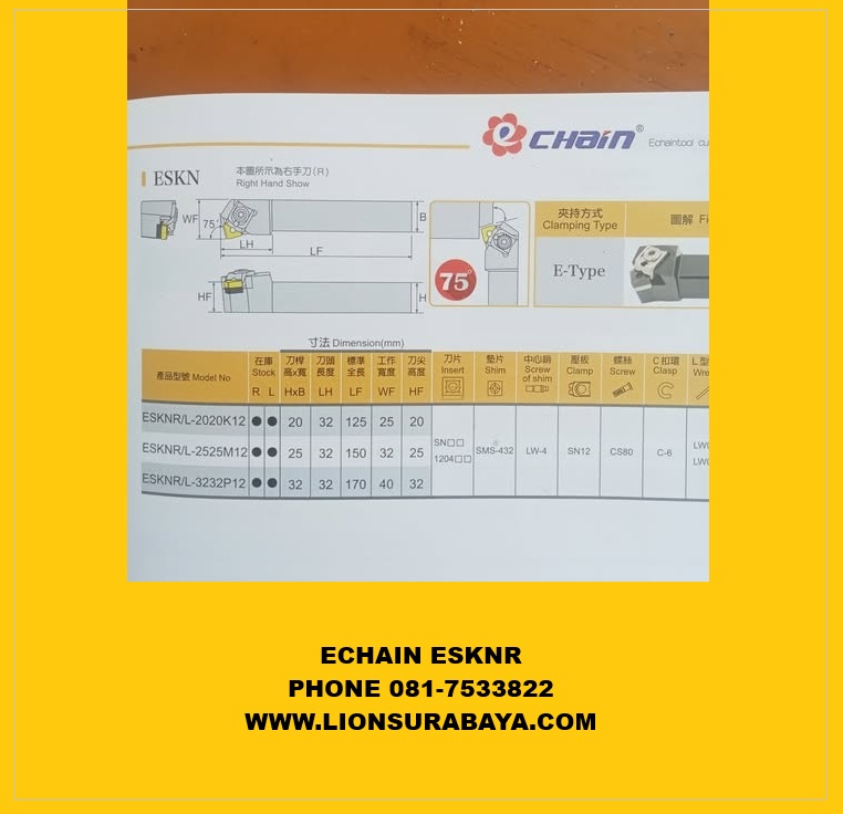 Holder bubut ESKNR dari Echain ini digunakan untuk aplikasi pembubutan luar, terutama untuk pengerjaan permukaan dan facing. Huruf "N" pada kode ISO holder (ESKNR) menunjukkan bahwa holder ini dirancang untuk menahan insert dengan sudut klirens 0 derajat (insert netral atau negatif), yang memberikan kekuatan potong yang baik untuk berbagai material. Berikut adalah rincian spesifikasinya: