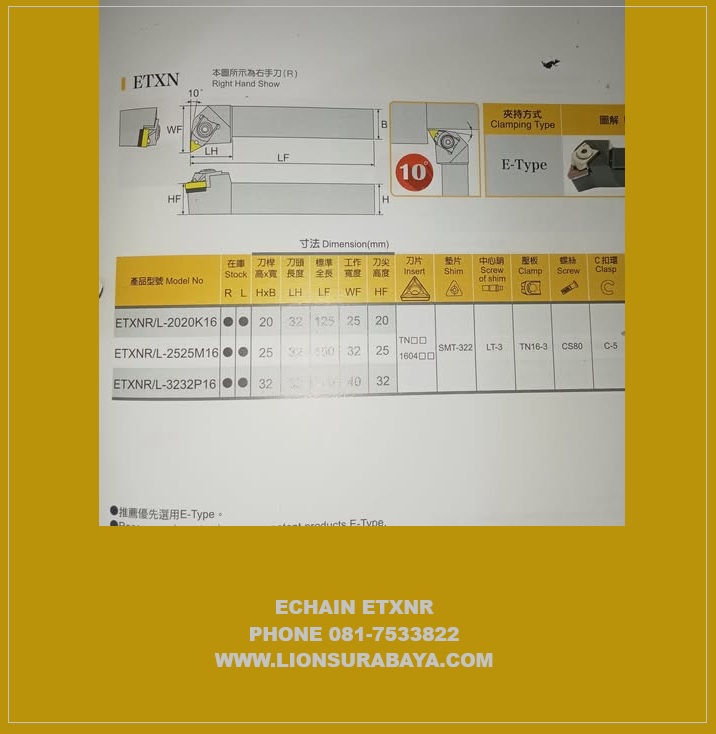 Jual Holder Bubut Luar ETXNR ( TNMG1604 ) Merk Echain