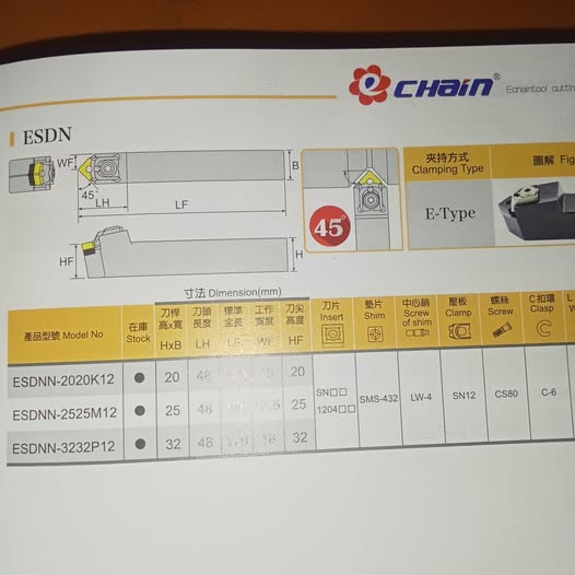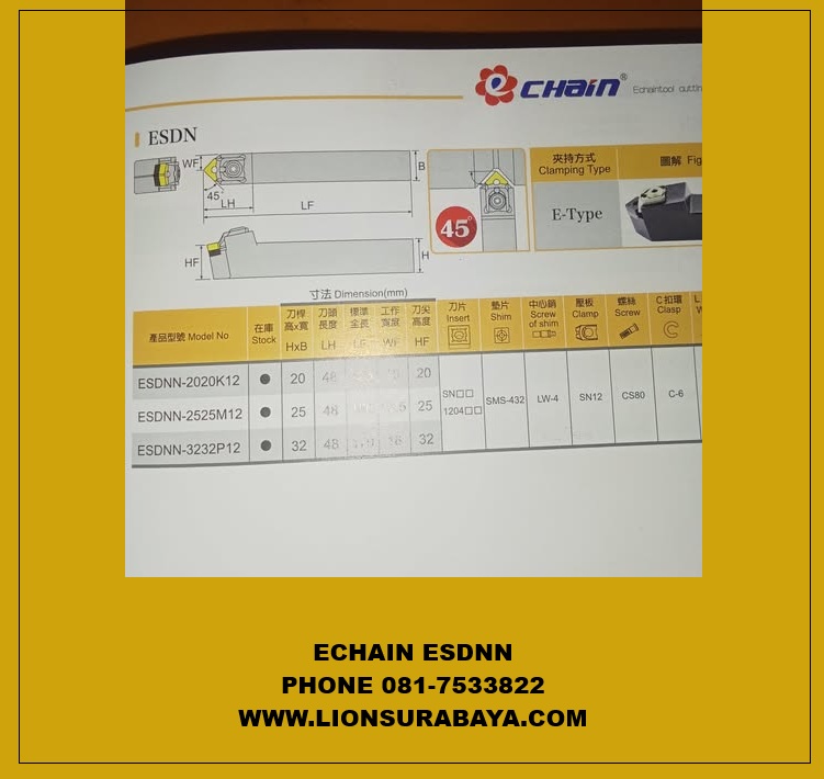 Berikut adalah rincian spesifikasi umum untuk holder bubut Echain ESDNN, yang tersedia dalam berbagai ukuran shank (gagang) seperti ESDNN-2020K12 atau ESDNN-2525M12: