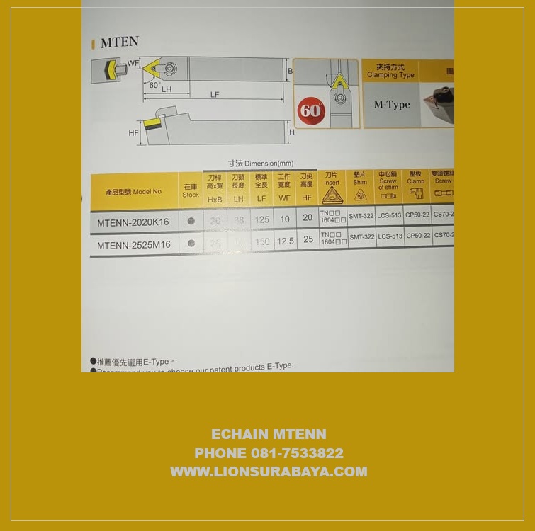 Produk BaruDetail Produk Jual Holder Bubut Netral MTENN ( TNMG1604 ) Merk Echain