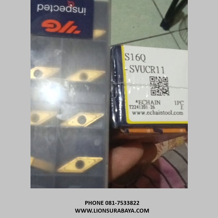 Holder S16Q-SVUCR11 dari Echain dan insert VCMT 110304 dari YG-1 tersedia dI CV Lion Machine Solution, dengan pilihan material shank yang berbeda untuk holder dan berbagai grade untuk insert.