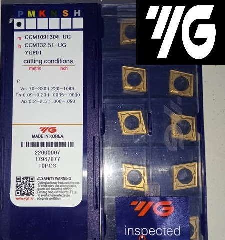 - YG801 (Grade): Merupakan grade universal dengan lapisan PVD (Physical Vapor Deposition) yang sangat tangguh untuk pemesinan baja (steel), baja tahan karat (stainless steel), dan besi cor (cast iron).