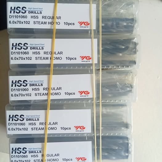 Mata bor YG-1 ukuran 6 mm tersedia dalam beberapa jenis, umumnya berbahan HSS (High-Speed Steel) yang cocok untuk mengebor besi atau kayu.