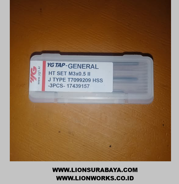 YG-1 hand tap M3x0.5 dengan nomor EDP T7099209 adalah tap lurus (straight flute) yang terbuat dari material High Speed Steel (HSS) dan biasanya dijual sebagai satu set berisi 3 buah.