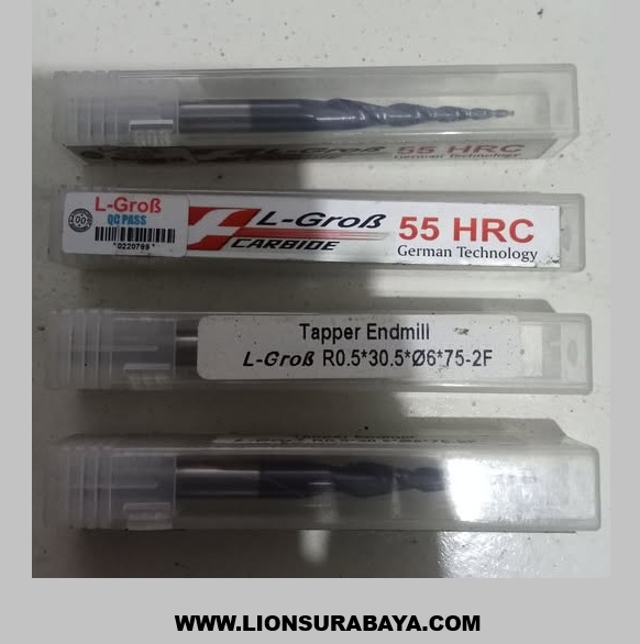 Taper Ballnose R0.5 Shank 6 Long 75 merek L-Grob adalah alat potong (cutting tool) jenis endmill yang umum digunakan pada mesin CNC untuk proses ukir 3D (engraving) atau milling material keras.